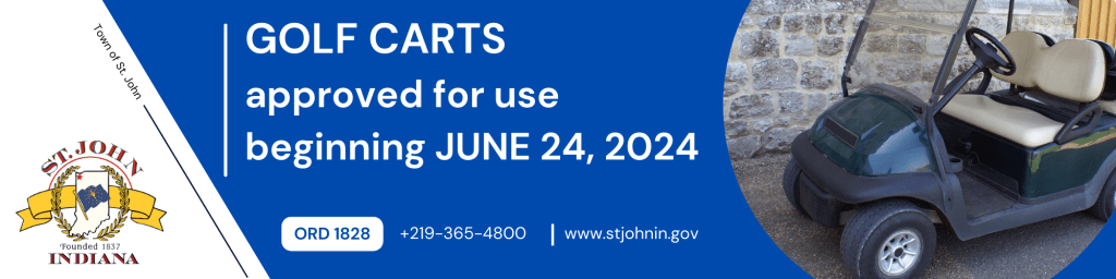 The Town Council has officially approved the use of golf carts beginning June 24, 2024. Golf cart usage is still prohibited until June 24, 2024. Interested residents must complete a registration form and pay a $50 annual fee expiring December 31st. Payment will be accepted, in person, at the Clerk-Treasurer’s office no sooner than June 24, 2024. All drivers must adhere to the rules and regulations found in Ordinance 1828.
