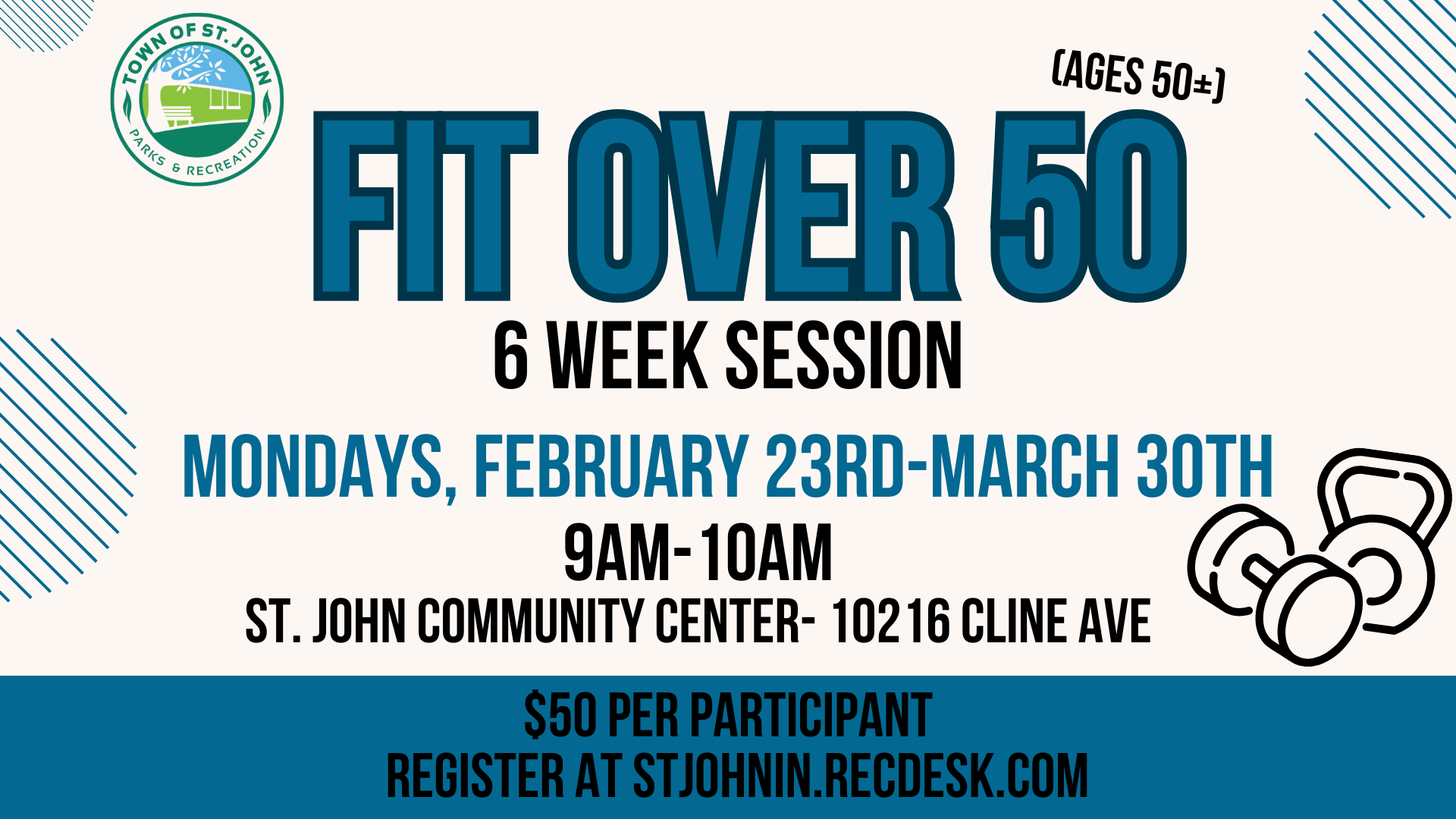 Join us for Fit Over 50 Mondays, February 23rd-March 30th. 9-10 AM at the St. John Community Center (10216 Cline Ave)!