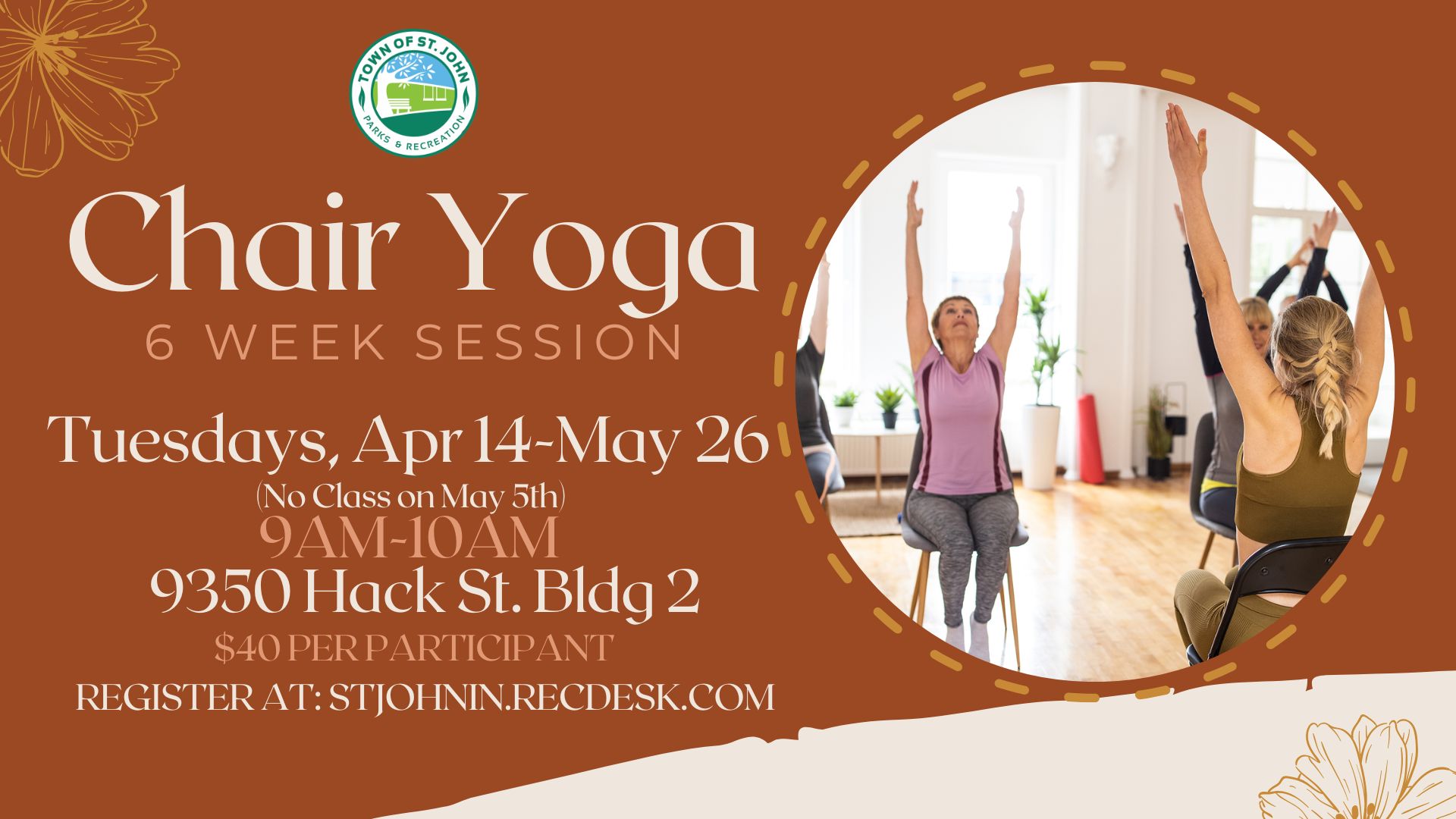 Join us for our 6-Week Chair Yoga Session on Tuesdays, April 14th- May 26th (No class on May 5th) from 9:00โ10:00 AM at the Parks Building- 9350 Hack St. Bldg 2!