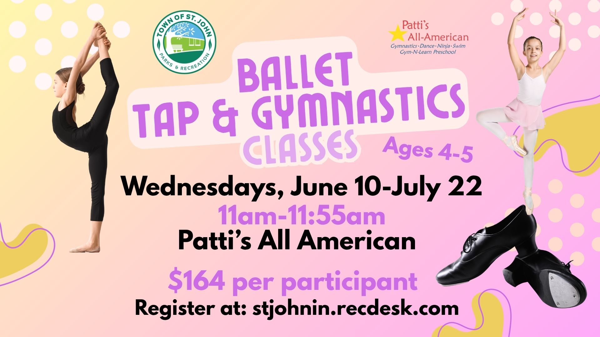 Students will begin with ballet, learning warm-ups, basic ballet technique at the barre, and center floor work to build coordination and confidence. The tap portion focuses on rhythm, basic tap steps, and simple combinations set to music. The class finishes with gymnastics activities in the main gym, where participants will practice skills on the floor, uneven bars, balance beam, tumble-trak, and trampoline.
